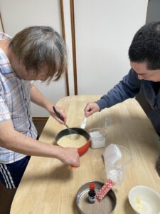 材料を混ぜる工程では、「腕が痛くなる〜!」と笑い声を上げながらも、最後まで一生懸命かき混ぜてくださいました。
