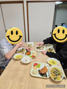 当日は、チキンレッグやポテトサラダ、ほうれん草ときのこのスパゲッティ、コーンポタージュなどをご用意し、「美味しいね」「ごちそうだね」と笑顔あふれるひとときとなりました😊🎶